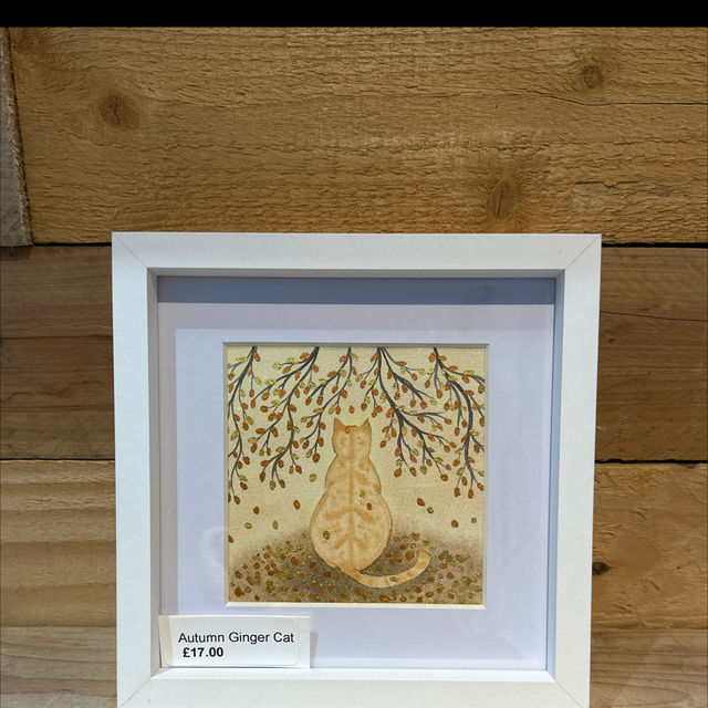 Hand painted autumn ginger cat picture with white frame