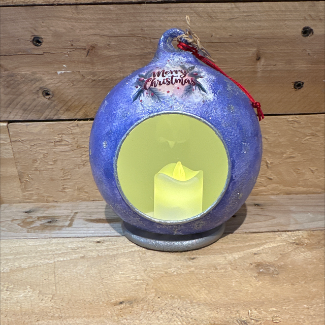 Decoupage Merry Christmas bauble on a stand. Does not include the light.